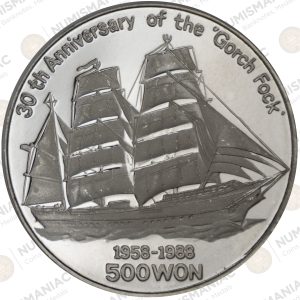 North Korea 🇰🇵 500 Won 1988 Silver Coin – Gorch Fock 30th Anniversary Commemorative Coin.