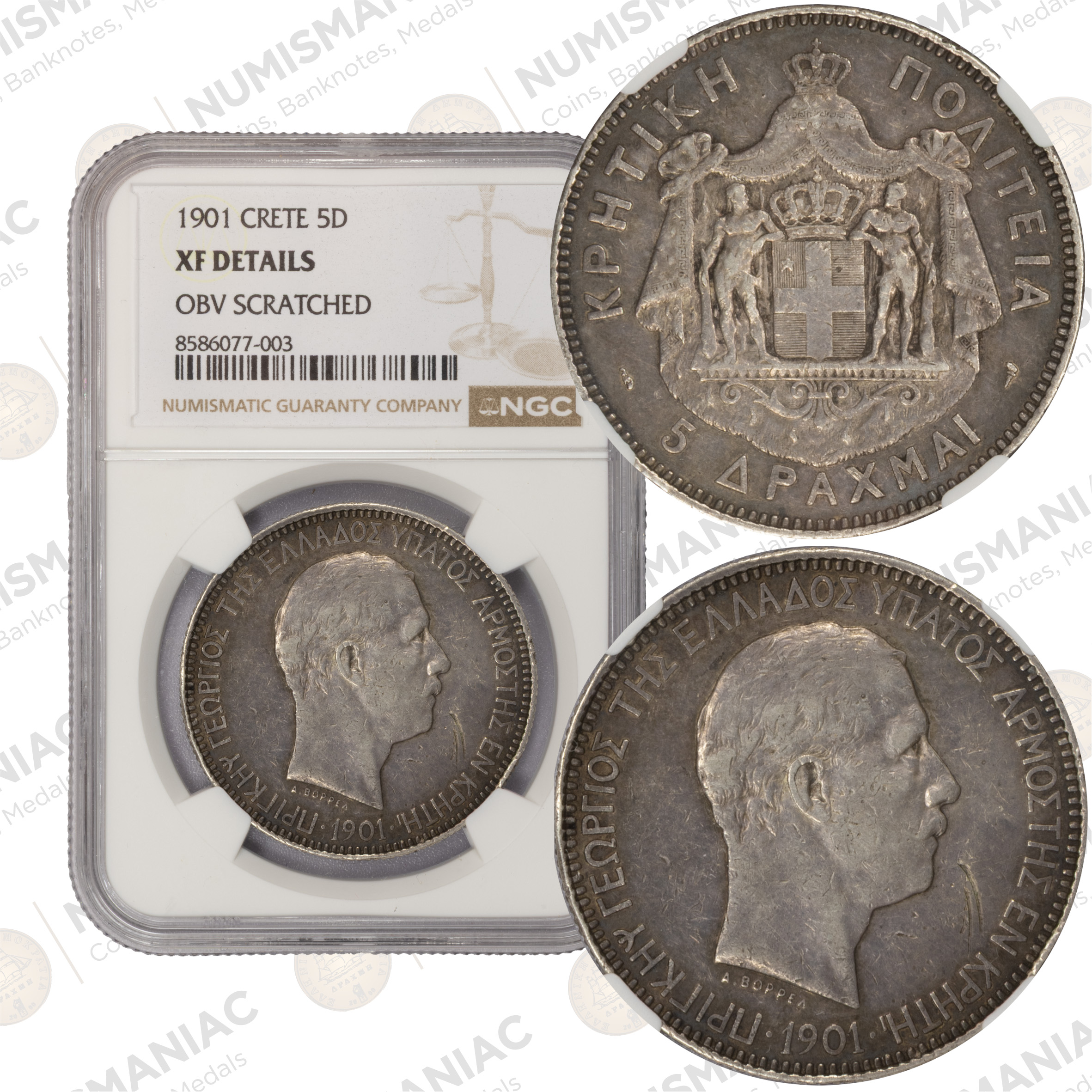 A historic silver issue from the Cretan State, struck during a pivotal period when Crete was an autonomous state under international protection, prior to its union with Greece. This 1901 5 Drachmai is among the most iconic large silver coins of the era.