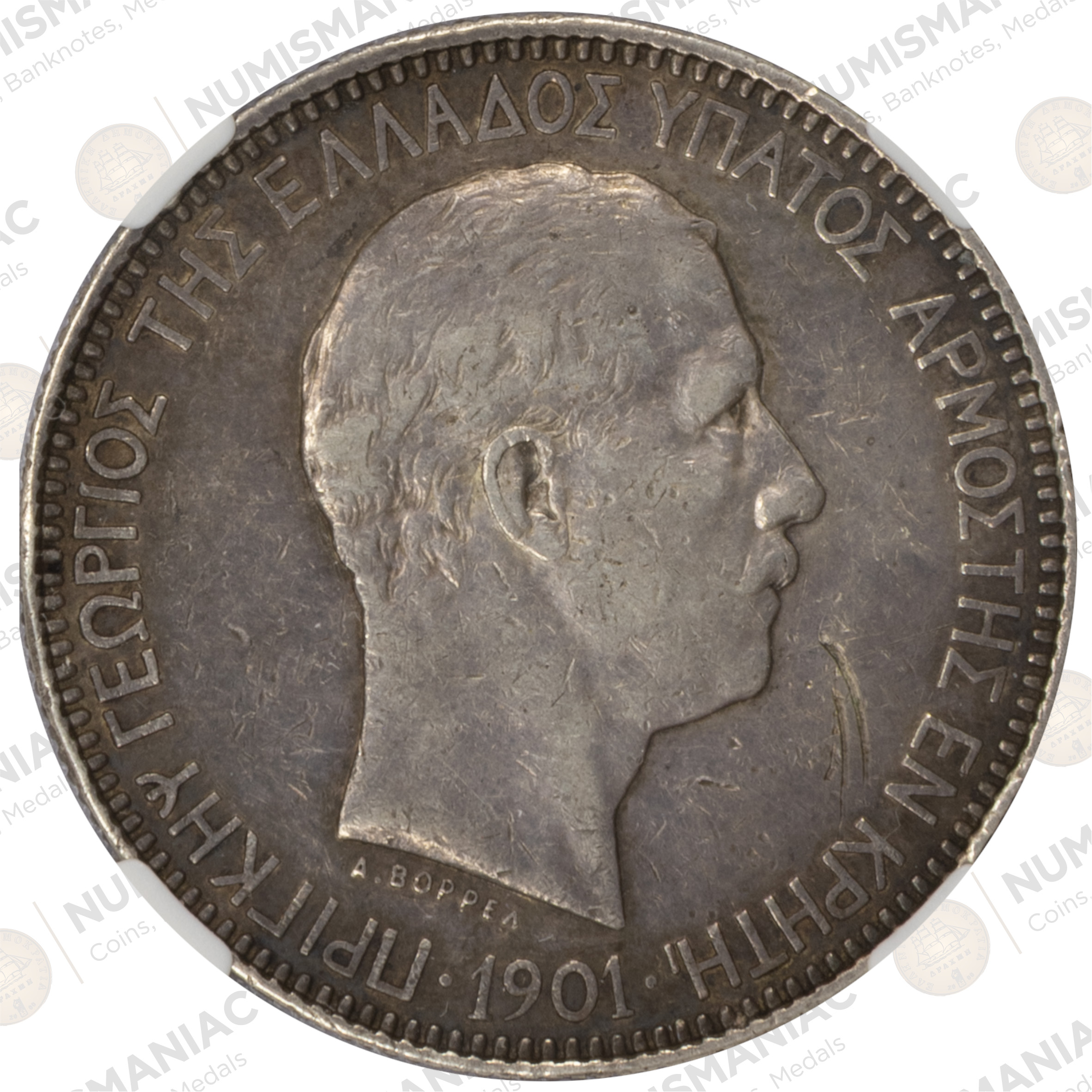 Right-facing bust of Prince George of Greece, High Commissioner of Crete, with Greek legend «ΠΡΙΓΚΗΨ ΓΕΩΡΓΙΟΣ ΤΗΣ ΕΛΛΑΔΟΣ ΥΠΑΤΟΣ ΑΡΜΟΣΤΗΣ ΕΝ ΚΡΗΤΗ». Engraver signature A. Borrell below.