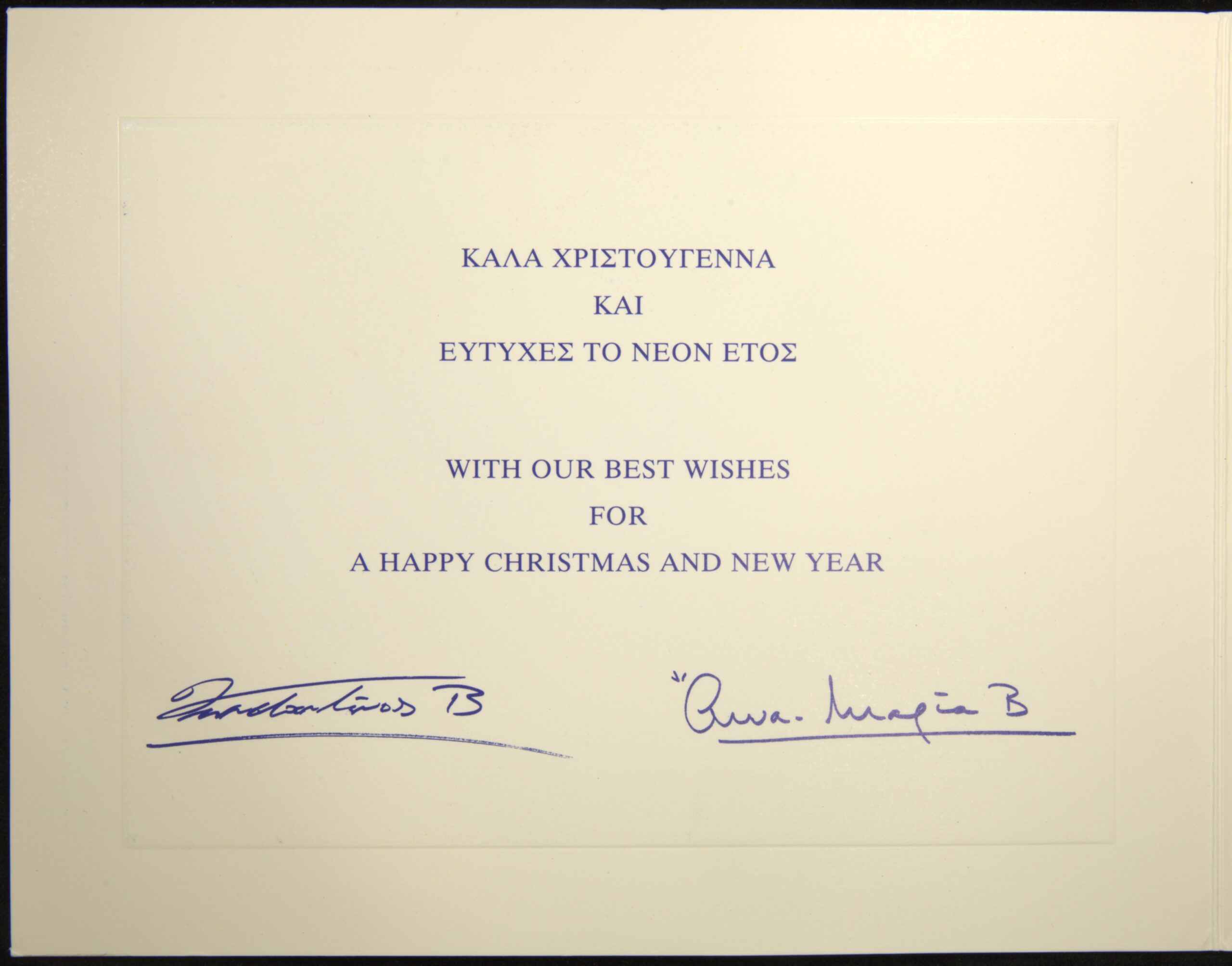 An authentic and highly collectible Royal Family Christmas card from 2006, with thw signatures of King Constantine II of Greece, the last reigning King of the Hellenes, and Queen Anne-Marie.