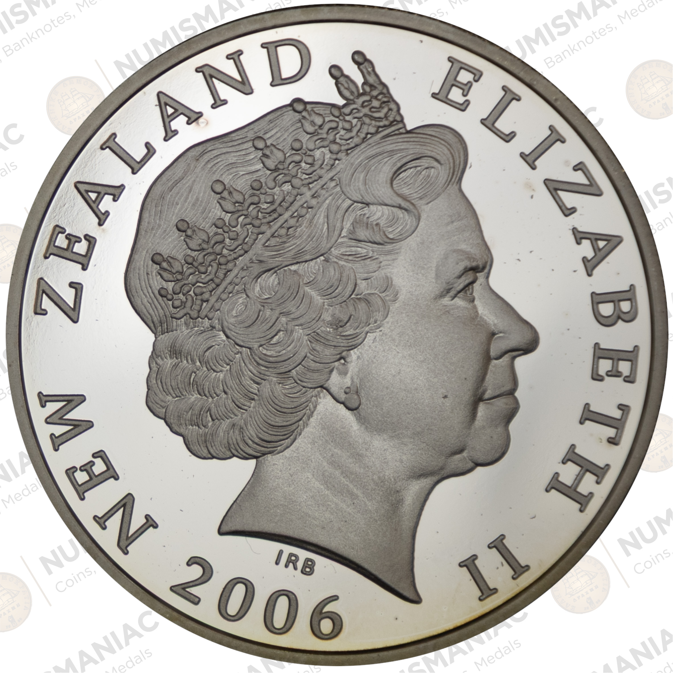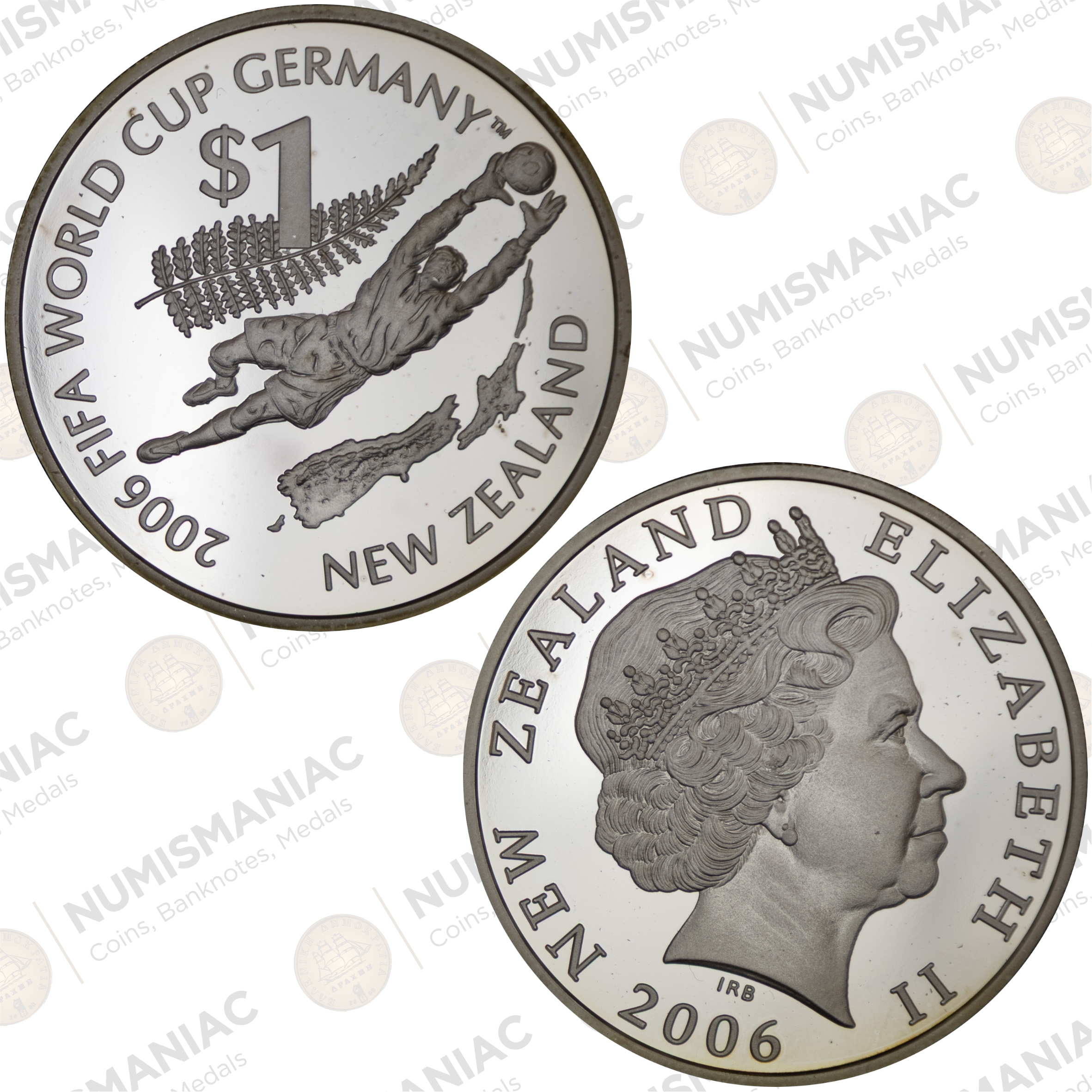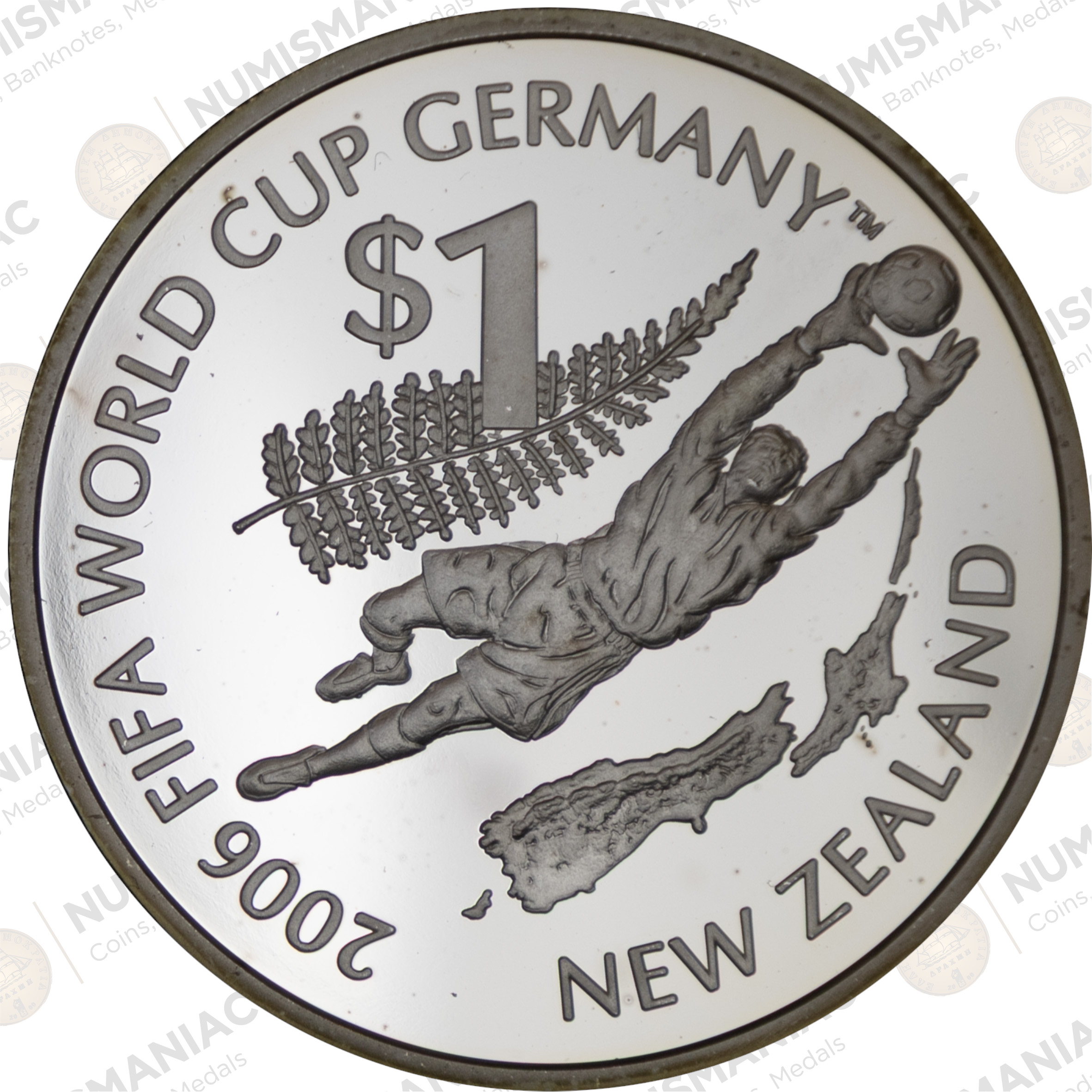 This 2006 New Zealand Silver Dollar was issued to mark the 2006 FIFA World Cup, hosted in Germany. Produced by the New Zealand Mint, the coin reflects modern minting quality combined with global sports appeal.