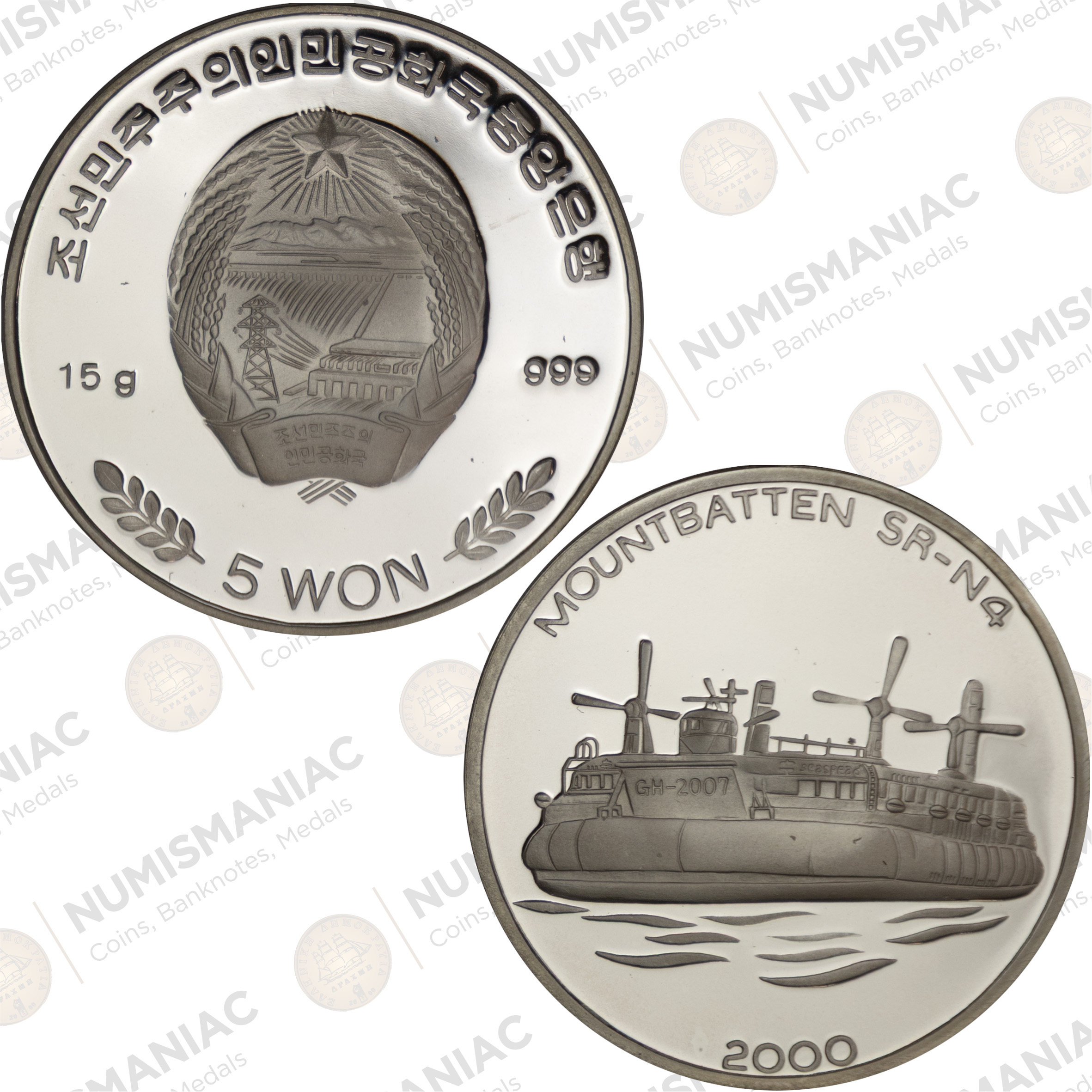 This 2000 North Korea 5 Won Silver Coin features the legendary SR.N4 Mountbatten-class hovercraft, once the largest commercial hovercraft ever built and a symbol of advanced maritime technology. Issued by the Central Bank of the Democratic People’s Republic of Korea, the coin reflects the unique and often internationally themed approach of DPRK numismatics.